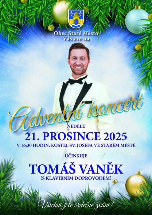 Adventní koncert v neděli 21.prosince 2025 v 16:30hod. v kostele sv.Josefa ve Starém Městě, účinkuje Tomáš Vaněk s klavírním doprovodem. Jste všichni srdečně zváni.