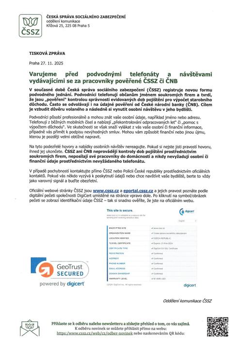 Varování před podvodnými telefonáty a návštěvami vydávajícími se za pracovníky pověřené ČSSZ či ČNB